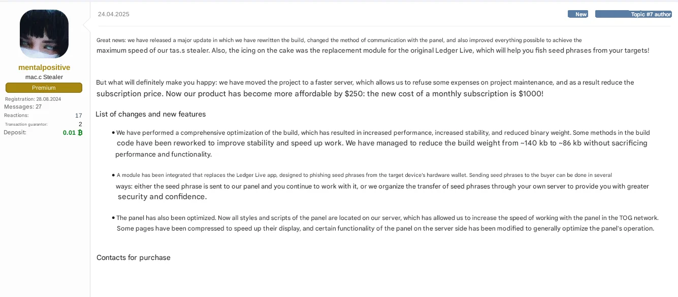 Злоумышленники в даркнете предлагают вредоносное ПО с функциями «анти-Ledger». Однако один из примеров, изученных Moonlock, не включал полную рекламируемую функциональность анти-фишинга Ledger. Фирма предполагает, что эти функции могут «все еще находиться в разработке или появиться в будущих обновлениях».