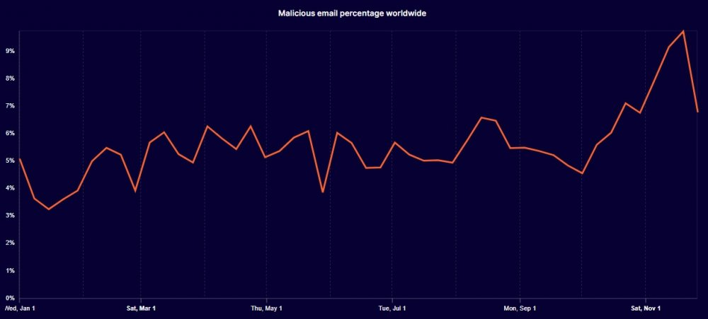 В ноябре доля вредоносных писем достигла 9,7 %. Источник: Cloudflare