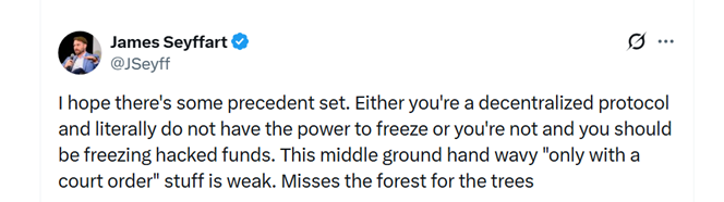 «Либо вы — децентрализованный протокол и буквально не имеете возможностей блокировать активы, либо вы должны это делать», — прокомментировал специалист.